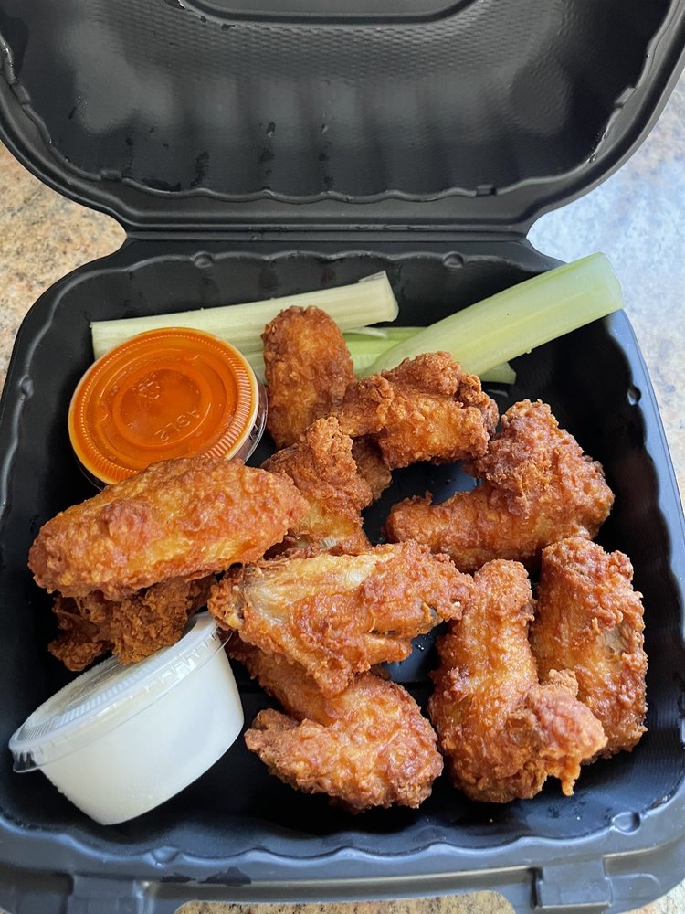 8 pieces. Cooked wing of a chicken coated in sauce or seasoning.